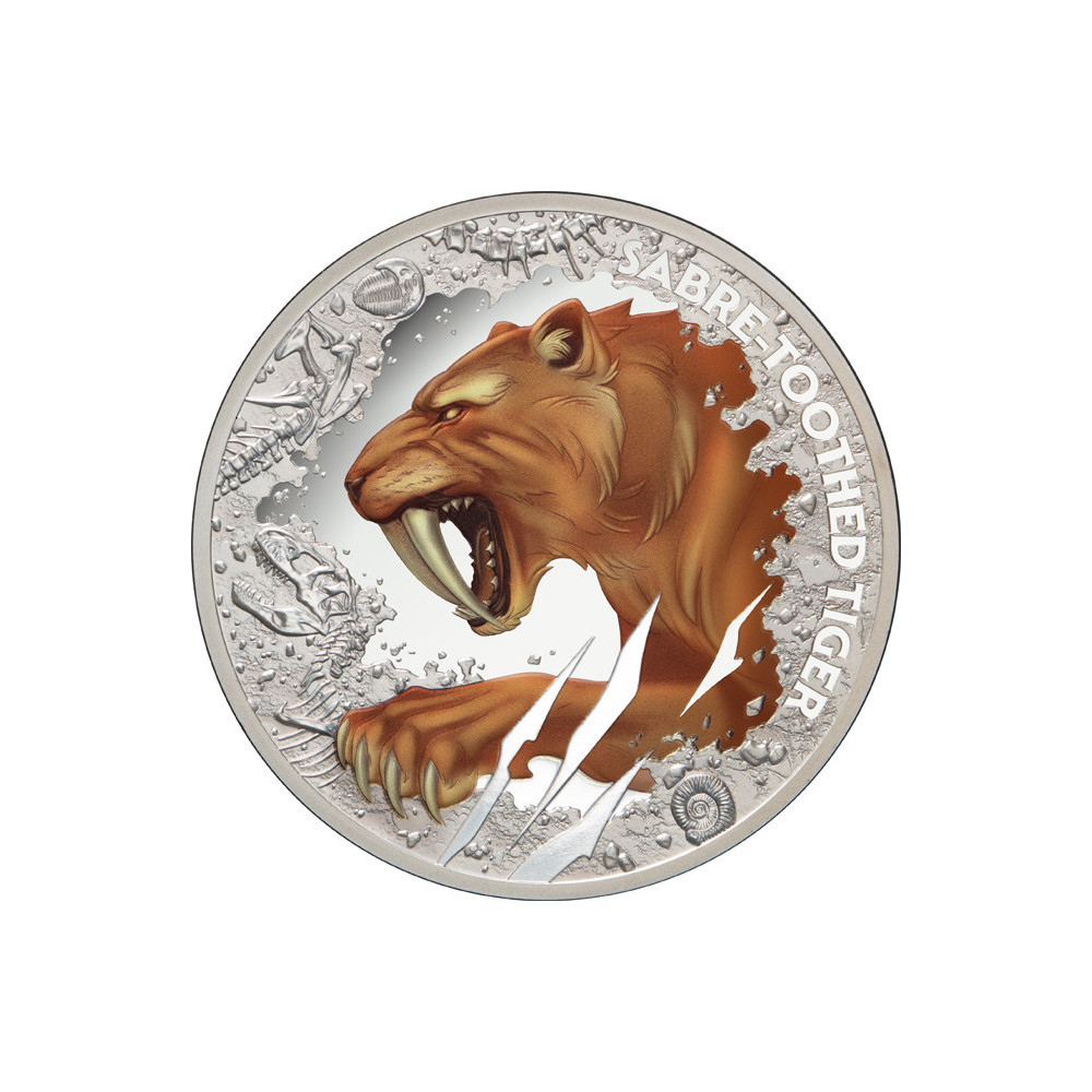 Ovaj srebrni novčić od 1 unce prikazuje žestinu sabljozubog tigra, jednog od najstrašnijih predatora pretpovijesnog svijeta.